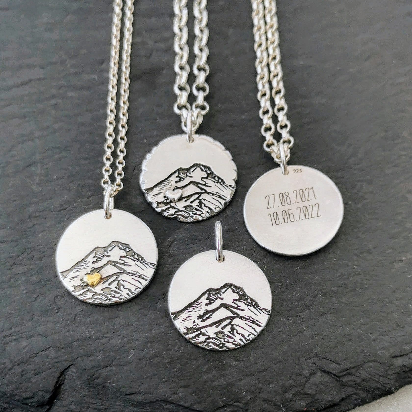 Handgefertigter Anhänger mit Berg-Motiv, hergestellt aus recyceltem 925er Sterlingsilber mit dunkler Patinierung. Ein einzigartiges Schmuckstück für alle, die die Berge lieben.